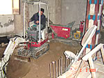 Realizando excavación con miniexcavadora en interior de una casa |